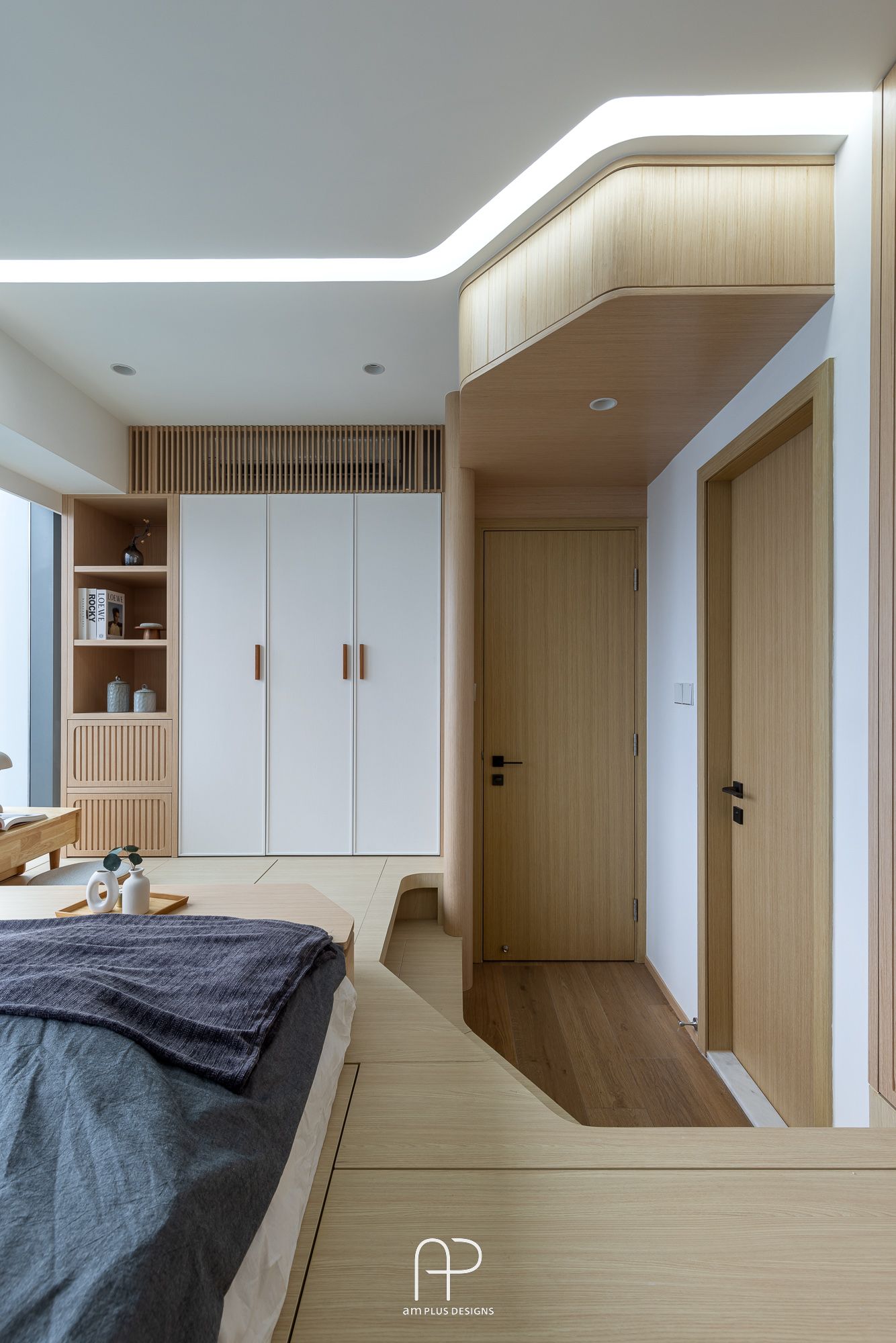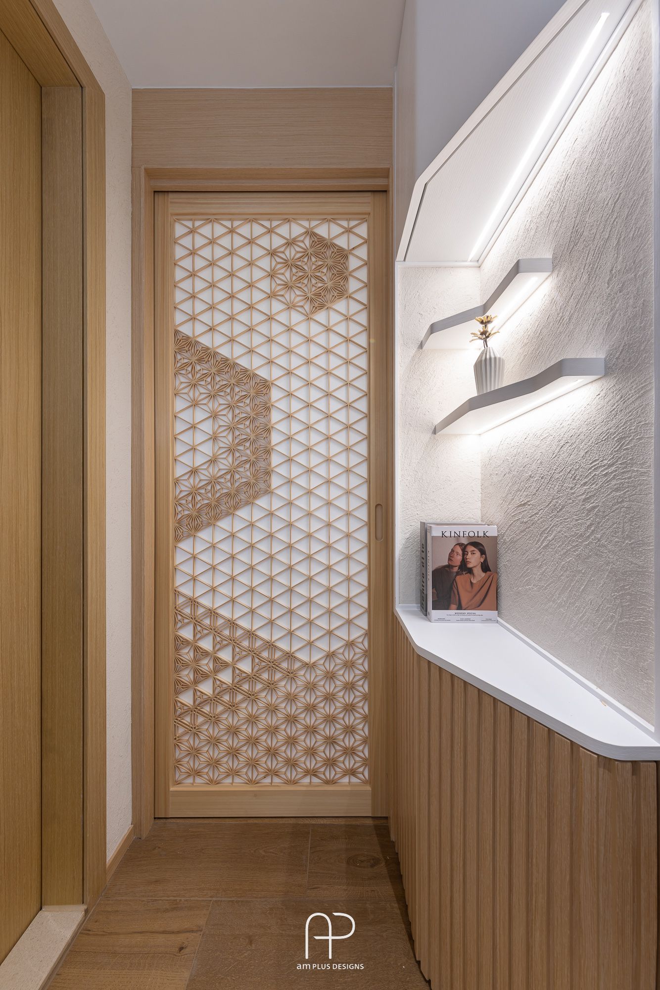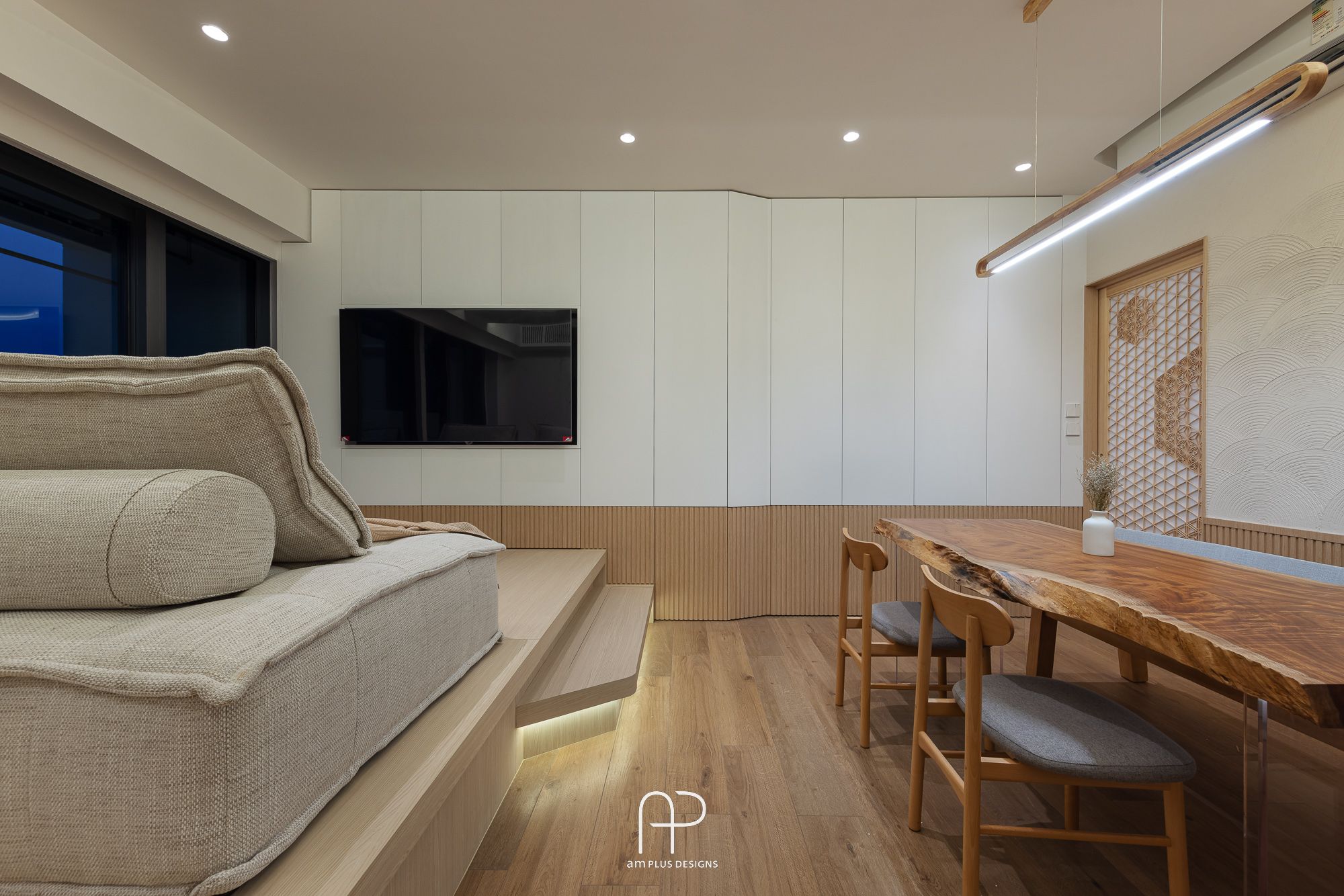 這次 am Plus 全屋空間掌握了日式設計核心,單位使用眾多傳統日式、自然、木質元素,並在造型、燈光、物料搭配上加入不同巧思,以有別以往的新式簡約日系風格,打造舒適居家空間。