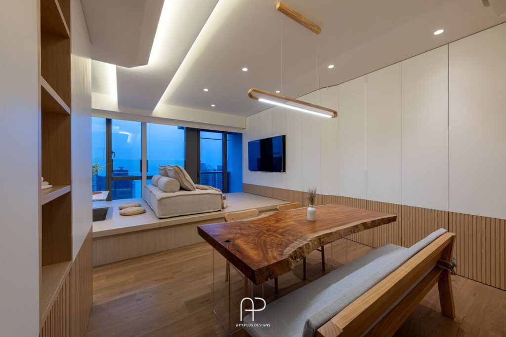 牆面及櫃體設計一路延續來到屋內開放區域;其中天花配合弧角造型燈槽設計,打造整體一致感,傢俬則以白色、木色、灰色等低飽和色調呈現簡約日系感,並在設計上結合許多功能性。